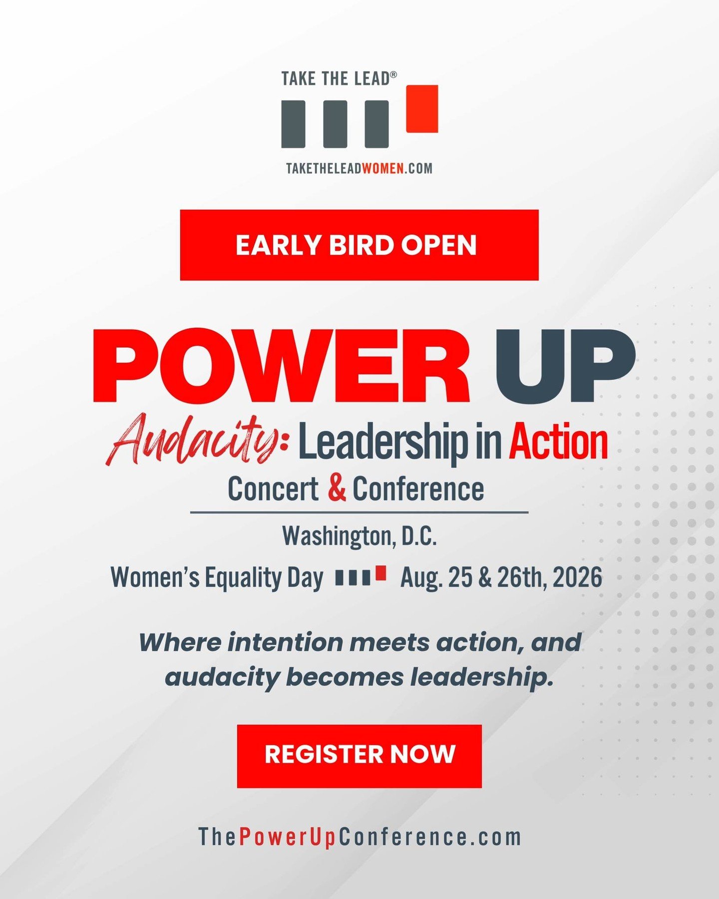 TAKE THE LEAD prepares, develops, inspires and propels women to take their fair and equal share of leadership positions across all sectors by 2025. It’s today’s women’s movement — a unique catalyst for women to embrace power and reach leadership parity.